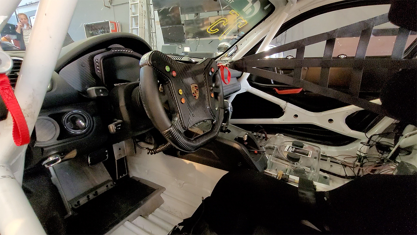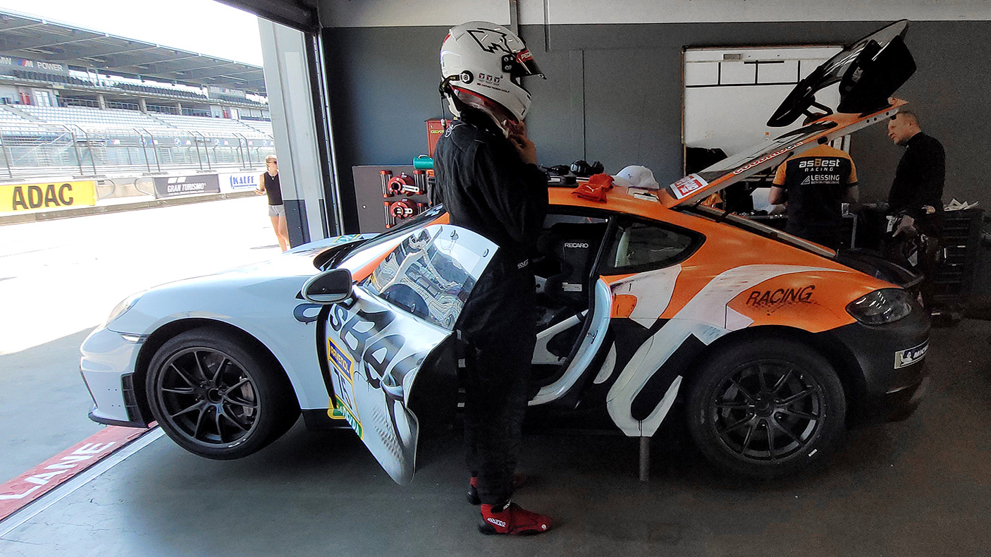 Mein Arbeitsplatz: Porsche Cayman GT4 CS Competition, 3,8l Sechszylinder - Mittelmotor mit 425 PS. Am Testtag mit 400 PS, im Rennen gedrosselt auf ca. 325 PS (wegen Permit B Reglement), 6-Gang PDK-Getriebe mit Schaltwippen, KW Cup Rennsportfahrwerk, Porsche 911 GT3 R Lenkrad, Sperrdifferential, 250er und 270er Michelin-Slicks, Überrollkäfig, Rennsitz mit 3-Punkt Renngurten, autom. Feuerlöschanlage, Leergewicht 1350 kg